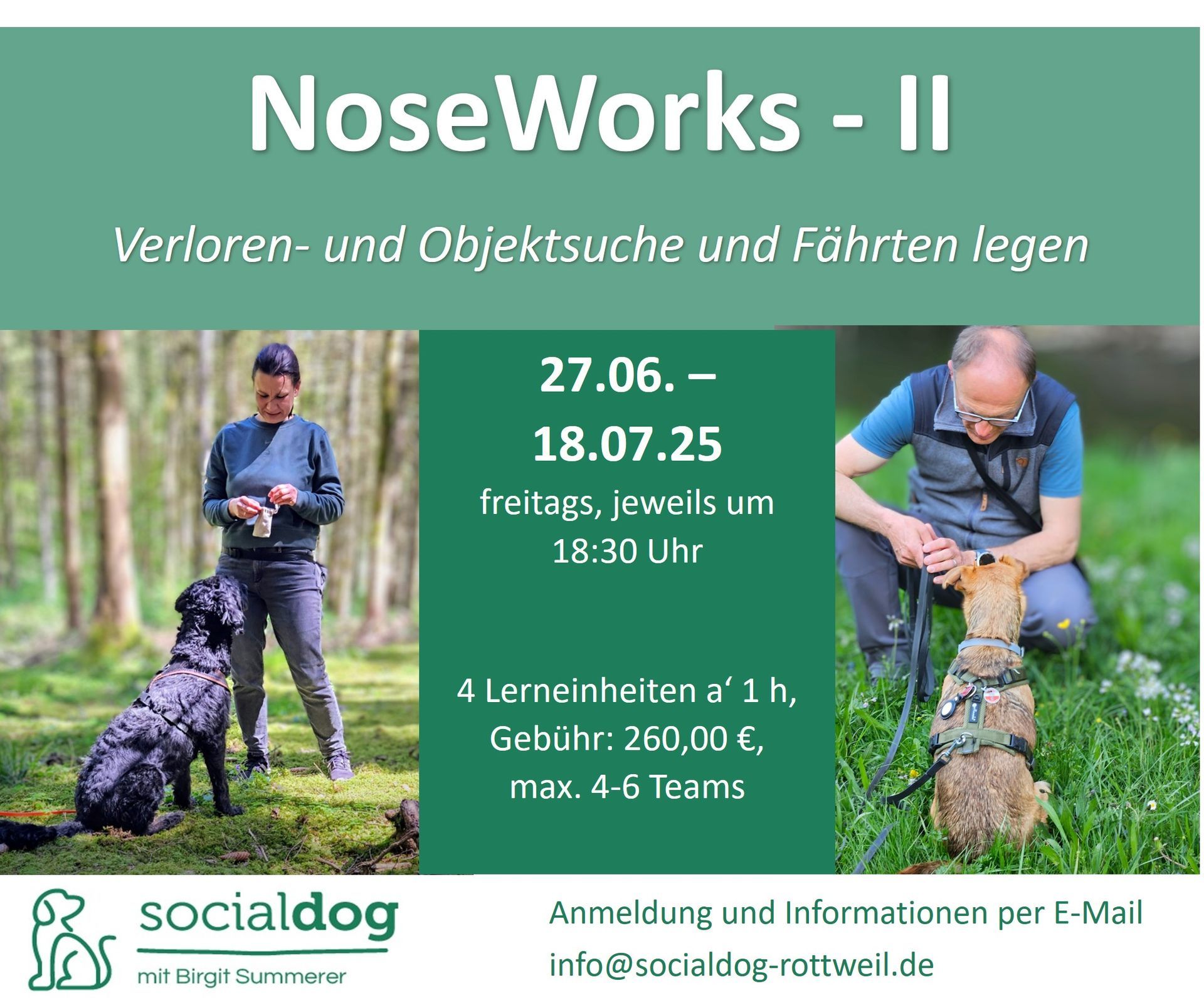 Denn es geht weiter mit meiner Spezialausbildung zum Super-Schnüffler bei „NoseWorks II“. Und du bist natürlich wieder dabei – ohne dich wäre ich ja nur ein Suchhund ohne Ziel!
